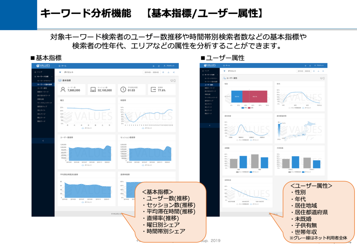 新ツール「Dockpit」のキーワード分析機能では、特定ワードのユーザー数推移や性年代、居住地域といった属性の分析がブラウザ上で分かりやすく行える