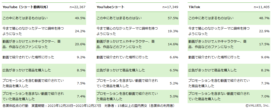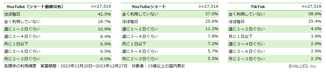 YouTube・YouTubeショート・TikTokの利用について、全国のヴァリューズモニター(15歳以上男女)を対象として、2023年12月20日~2023年12月27日にアンケート調査を実施(回答者 27,519人)。