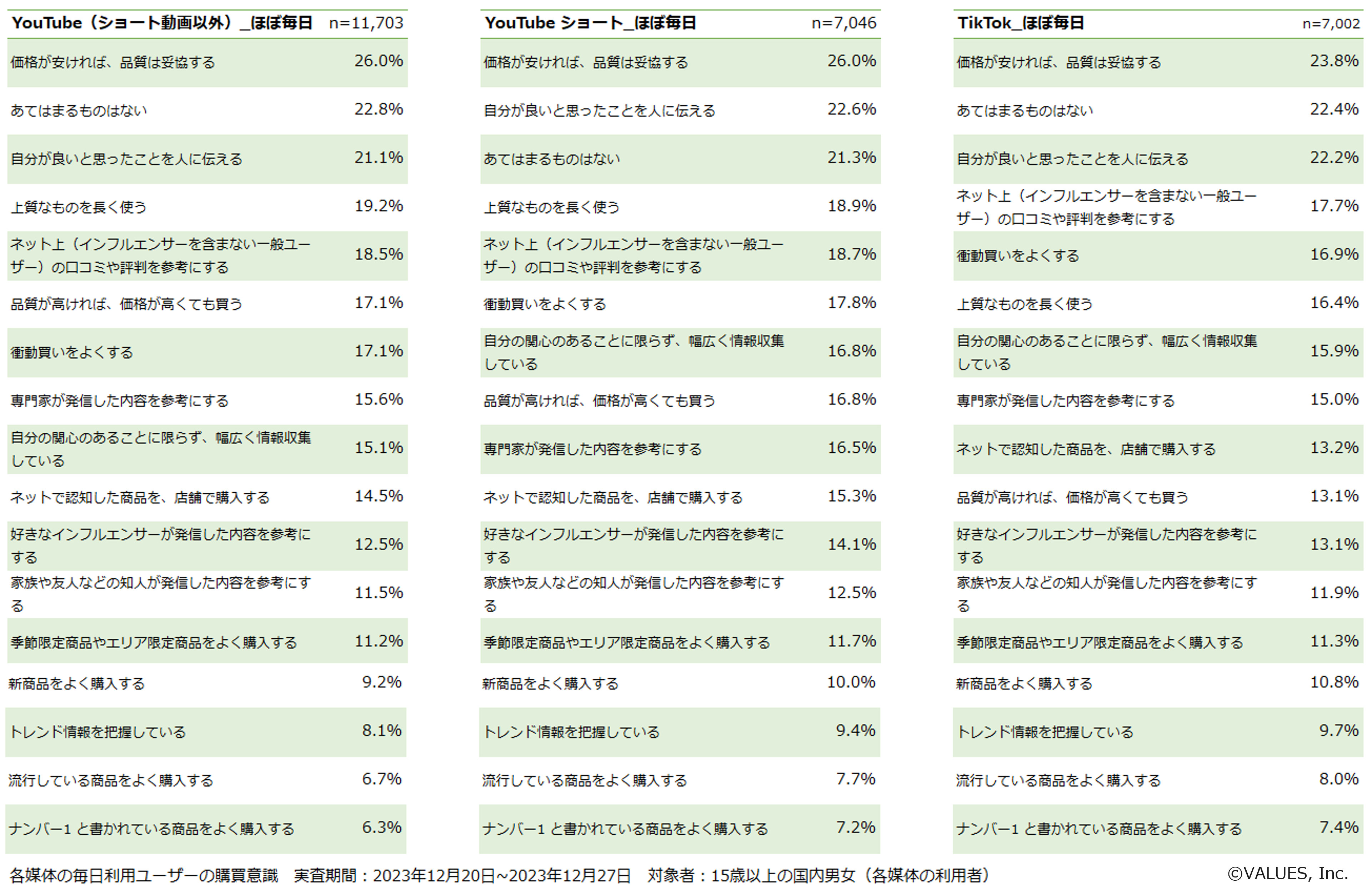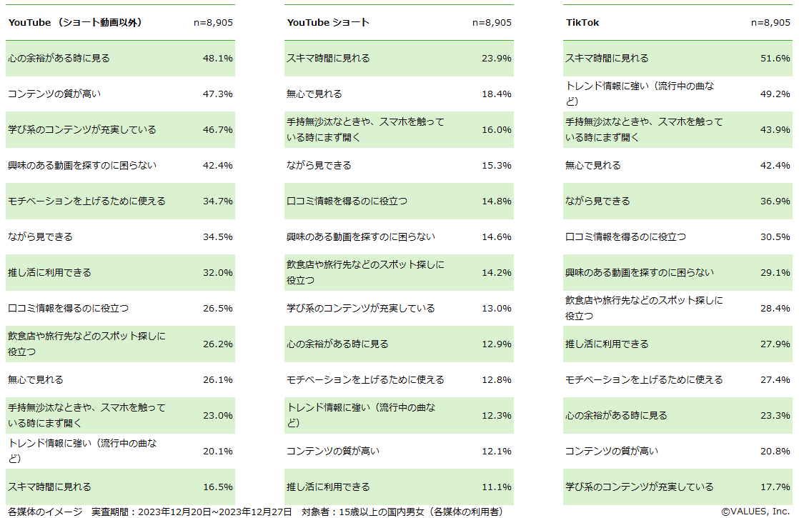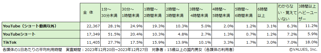 インターネット行動ログ分析によるマーケティング調査・コンサルティングサービスを提供する株式会社ヴァリューズ(本社:東京都港区、代表取締役社長:辻本 秀幸、以下「ヴァリューズ」)は、国内の15歳以上の男女27,519人を対象に、YouTube・YouTubeショート・TikTokの利用に関する消費者アンケート調査を実施しました。