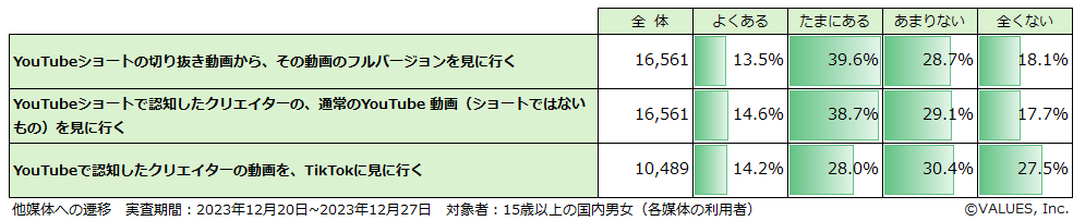 「YouTubeショートの切り抜き動画から、その動画のフルバージョンを見に行く」「YouTubeショートで認知したクリエイターの、通常のYouTube 動画(ショートではないもの)を見に行く」について、YouTubeからYouTubeショートへの遷移は、いずれも「よくある」「たまにある」の合計が約半数となっており、遷移派と遷移しない派でほぼ半々になっていることがわかります。