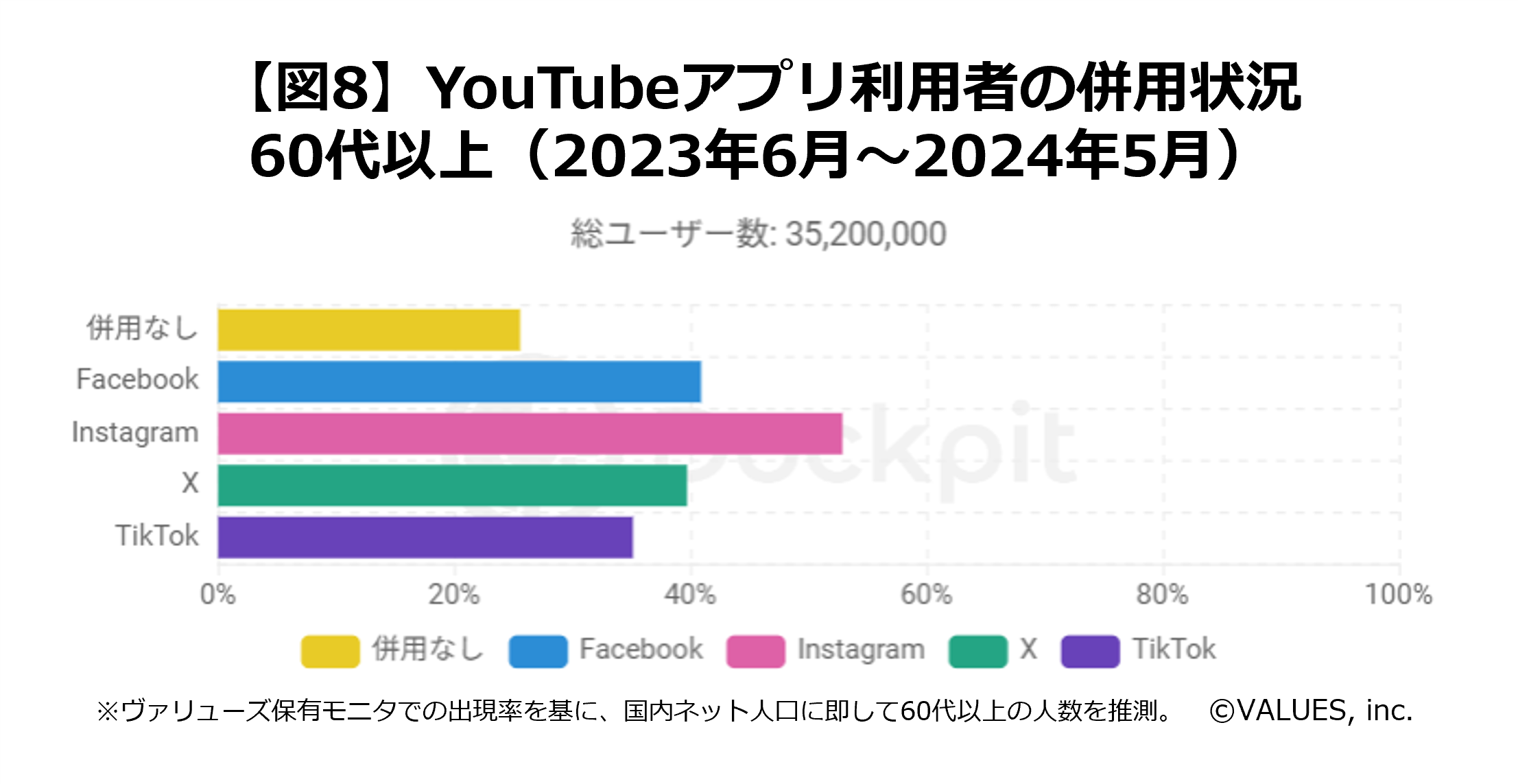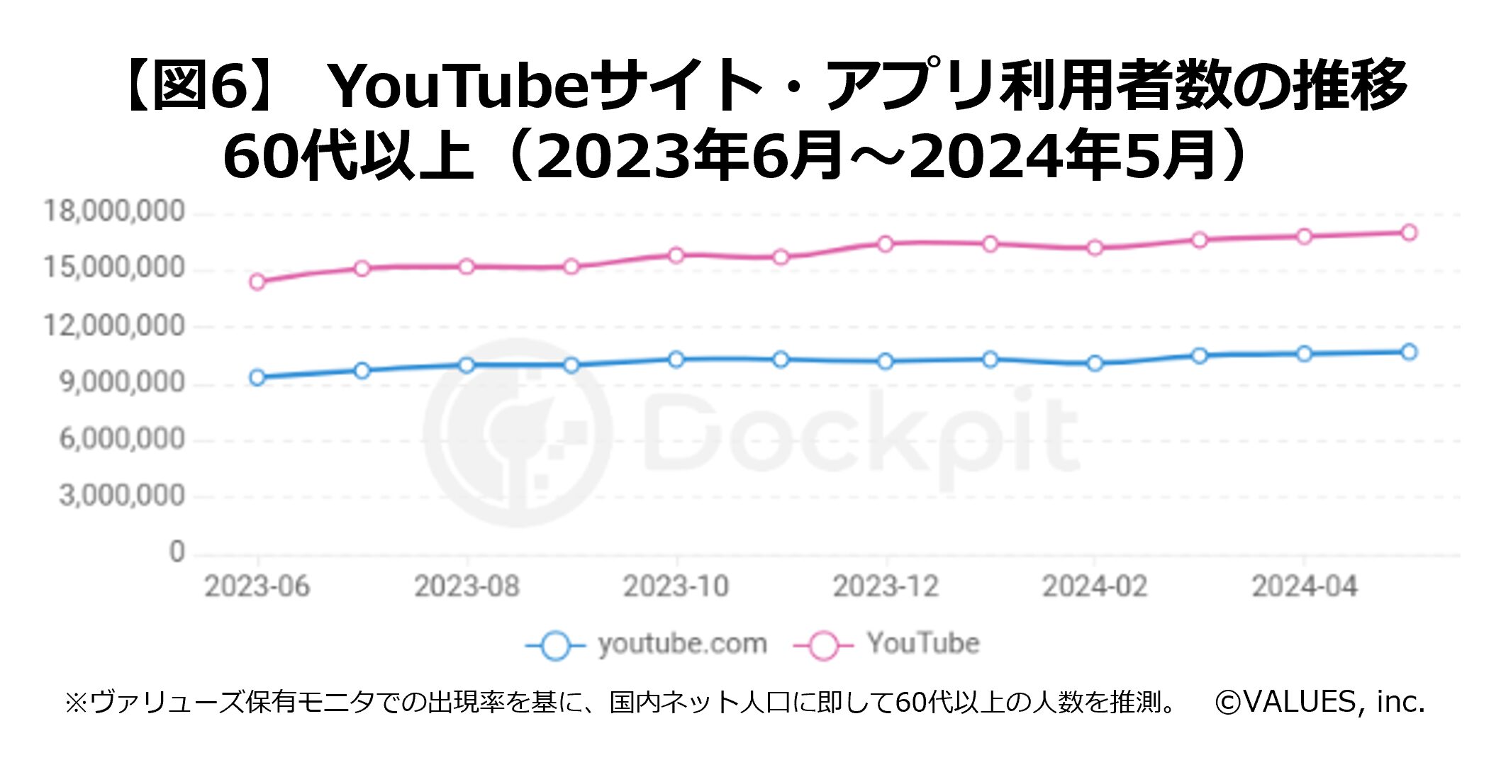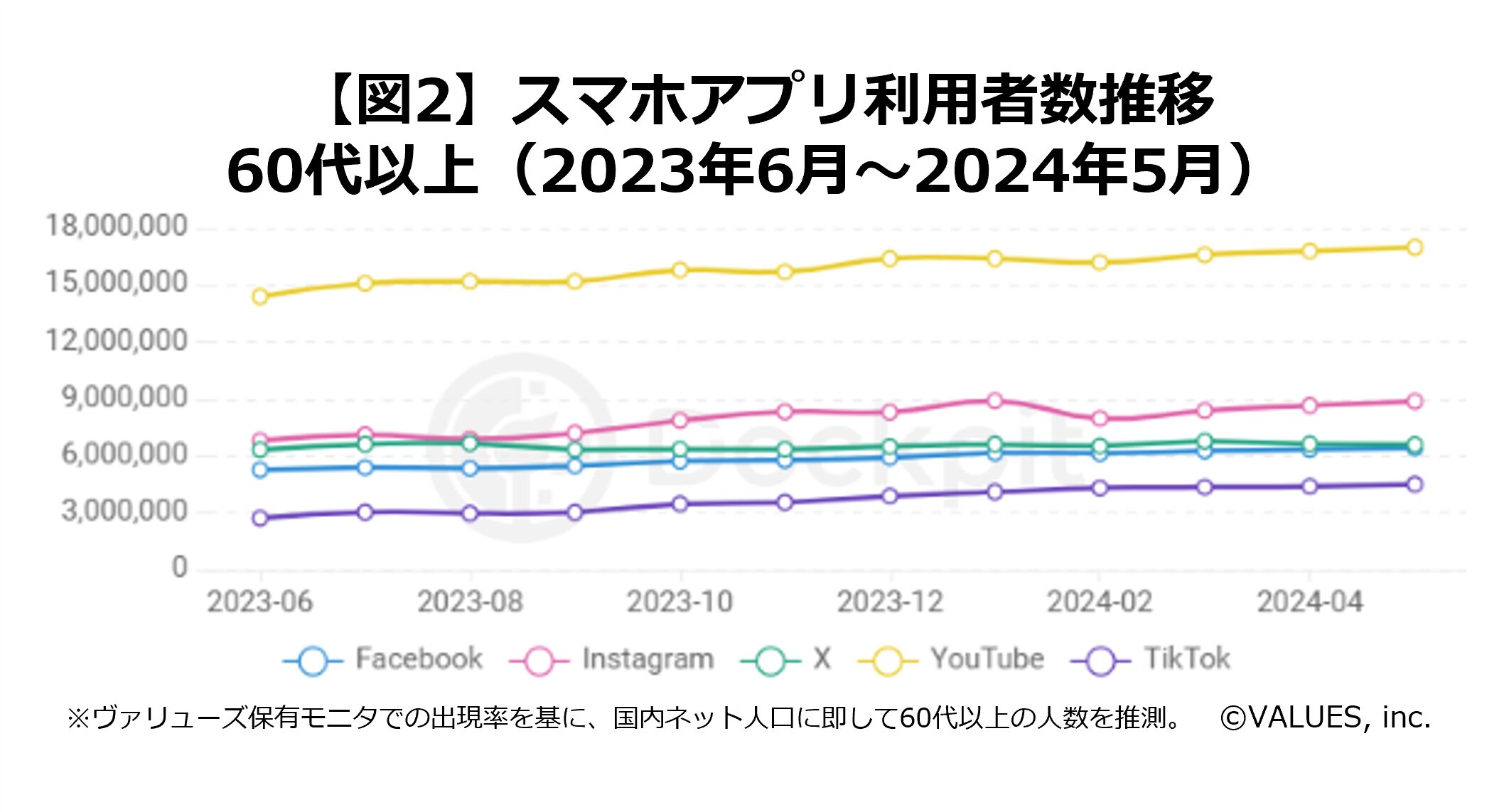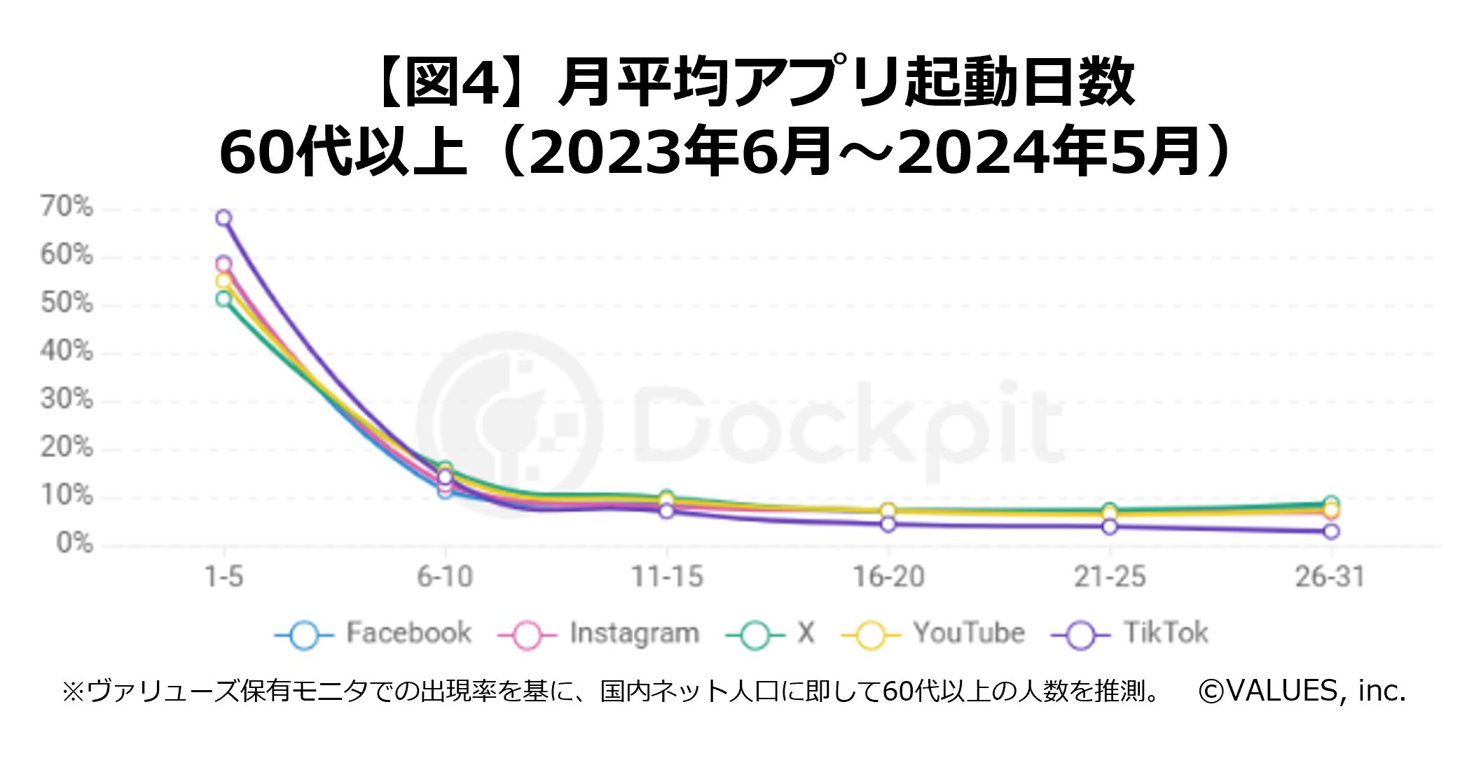 インターネット行動ログ分析によるマーケティング調査・コンサルティングサービスを提供する株式会社ヴァリューズ(本社:東京都港区、代表取締役社長:辻本 秀幸、以下「ヴァリューズ」)は、独自保有する国内約250万人の消費者パネルを活用したインターネット行動ログ分析ツール「Dockpit(ドックピット)」を使用して、シニア世代におけるSNS利用の実態を調査しました。