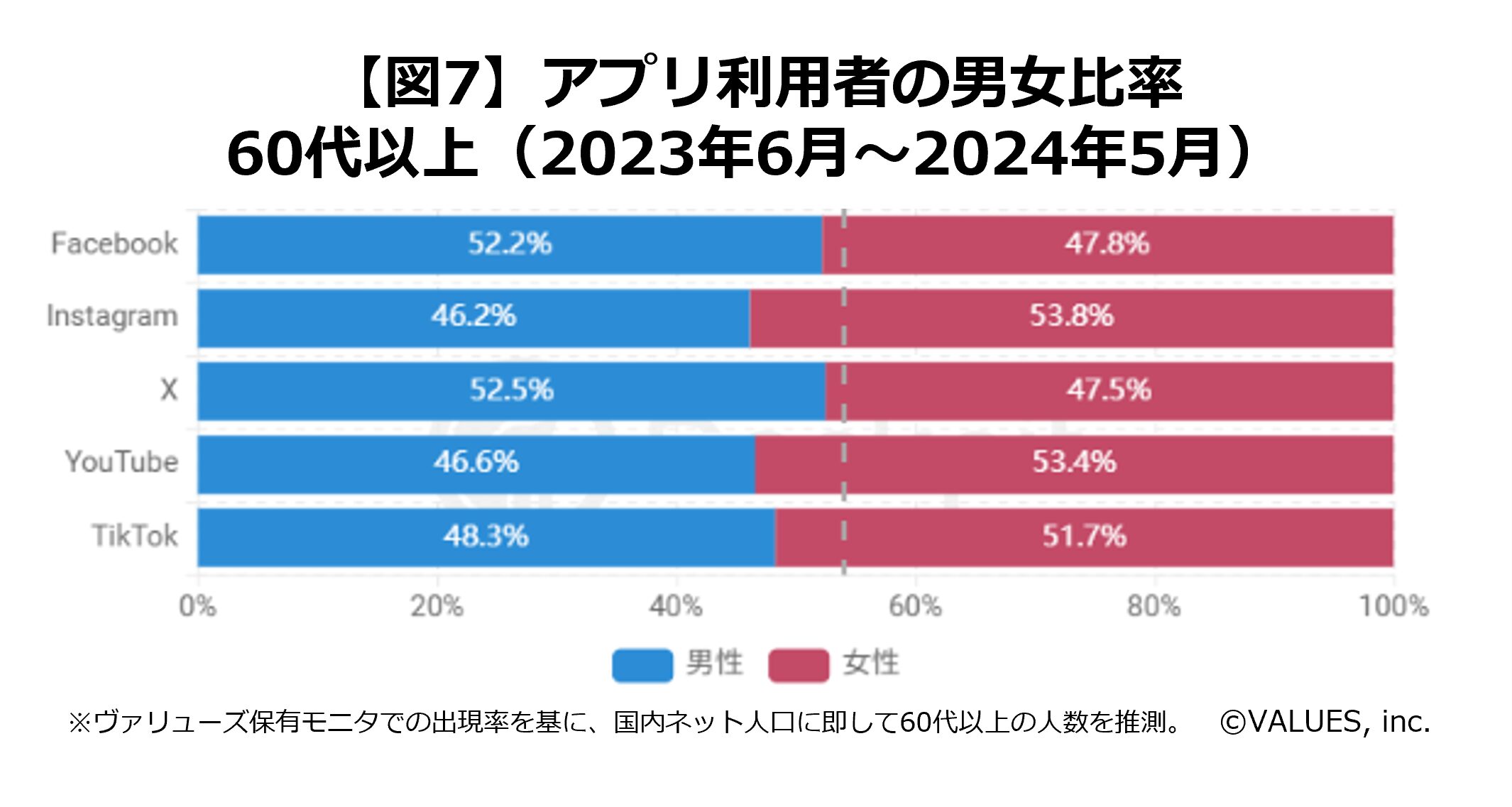 シニアに注目してみると、FacebookとXが若干男性寄り、InstagramとYouTubeがやや女性寄りになっていますが、いずれの媒体も男女比はおよそ5:5となっており、どちらかに偏ったアプリは見られません。