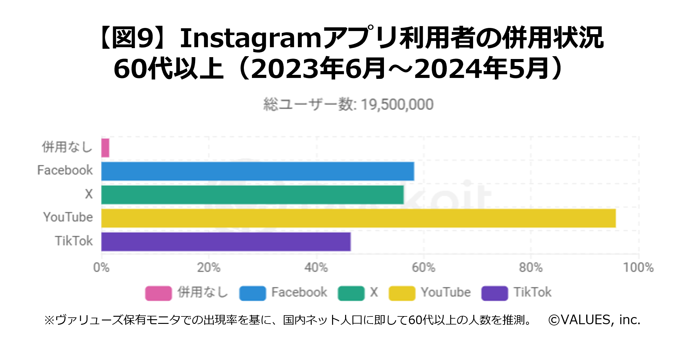 Instagramの利用者を見てみると、YouTubeが約96%と集中しており、「併用なし」は極めて少なくなっています。やはり、シニアのSNS=YouTubeがベース、と考えられそうです。