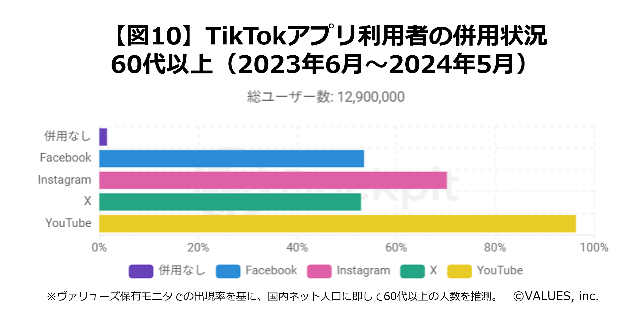 最も利用者が少ないのはTikTokとなっており、ここにも20代との違いが見られます。しかし、2024年5月と2023年6月を比べると、Facebook:約1.2倍、Instagram:約1.3倍、X:約1.0倍、YouTube:約1.2倍、TikTok:約1.7倍となっており、TikTokの伸びが最も大きく、追い上げを見せていることがわかります。