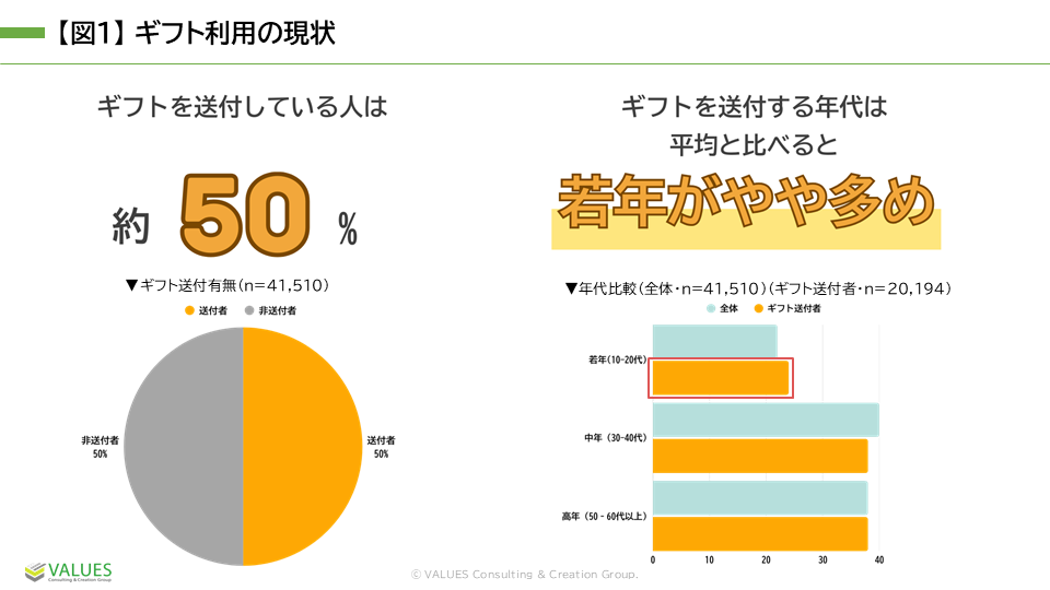 インターネット行動ログ分析によるマーケティング調査・コンサルティングサービスを提供する株式会社ヴァリューズ(本社:東京都港区、代表取締役社長:辻本 秀幸、以下「ヴァリューズ」)は、国内の15歳以上の41,501人を対象に、ギフト利用に関する消費者アンケート調査を実施しました。