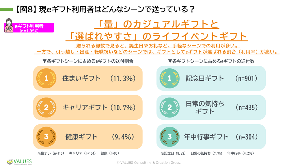 eギフトはどのようなシーンで利用されているのでしょうか。各ギフトシーンにおけるeギフト送付割合を調べたところ、最も多かったのは「住まい関連ギフト(引っ越し・新築祝いなど)」で、「キャリア関連ギフト(就職・昇進・退職祝いなど)」「健康関連ギフト(快気祝いなど)」が続きました。これらは、前述した「直近5年間でギフトの送付が増えた」と回答した人の割合が高いギフトシーンと一致し、手軽に送ることができるeギフトが、贈答を促進する後押しとなっていることも考えられます。