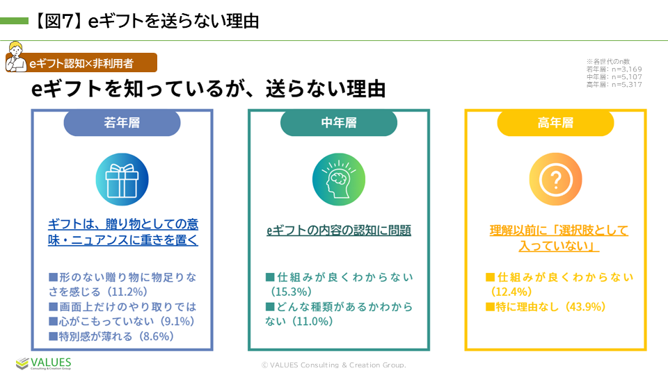 eギフトを送らない理由を年代別に見てみると、若年層では「形のない贈り物への物足りなさ」、中年層は「仕組みや種類への理解不足」、高年層は「そもそも選択肢に入っていない」が挙げられました。