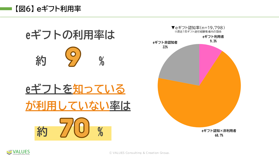 また、eギフトは、手軽さや利便性という強みを持ちながらも、利用者と非利用者の間に隔たりが存在します。今後eギフトが市場をさらに拡大するためには、世代ごとの異なるニーズや心理的障壁を理解し、それぞれに寄り添ったアプローチを展開していくことが重要となるでしょう。