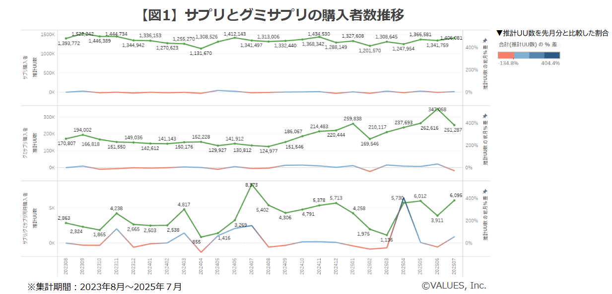 従来型サプリ(以後「サプリ」表記)は2023年8月~2025年7月の2年間で約140万人/月のペースで購入されていることが分かりました。また、購入されるトレンドに季節性はなく、生活の中に定着している様子がうかがえます。一方、グミサプリは2024年8月以降購入者数が増え、2025年3月以降は約20万人/月のペースで購入されています。サプリとグミサプリの同時購入者も出現し、飲用方法の違う栄養補助品を同時に使用している消費者が一定いることが明らかになりました。