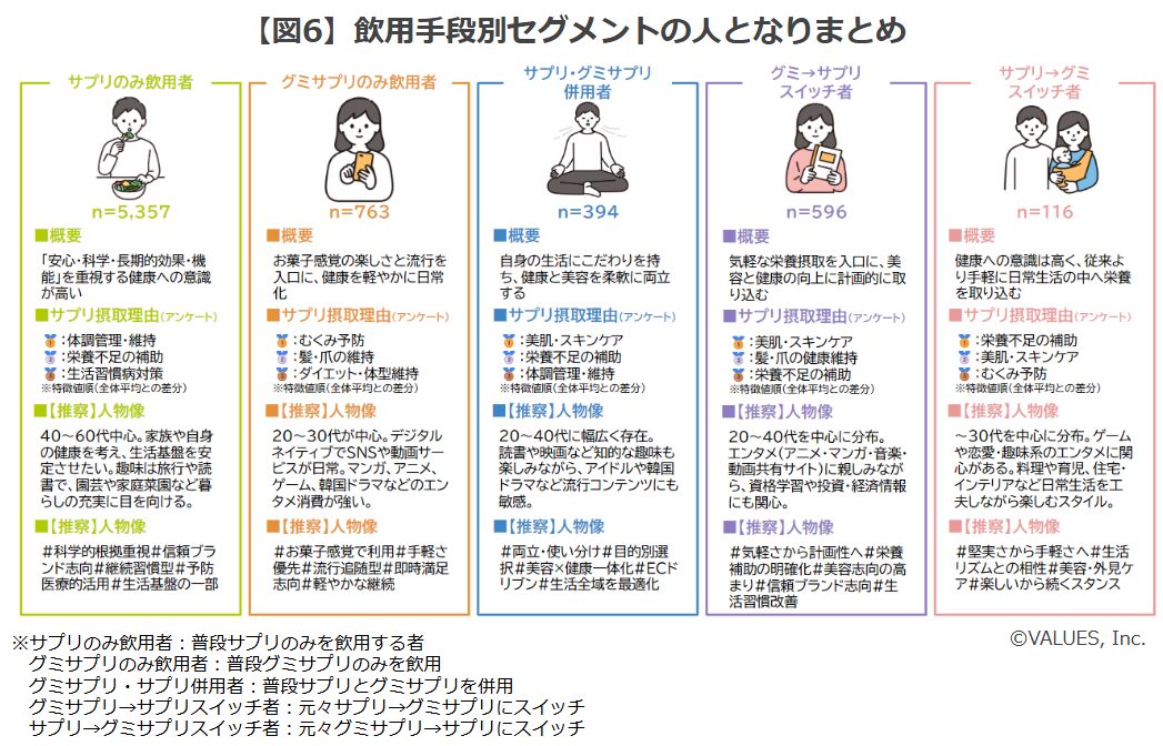 その他のセグメントについても、サプリのみ飲用者と同様に人物像について整理しており、図6では、各セグメントの人となりの概要をまとめています。各Web上での実行動からわかる特徴や人物像・サプリ飲用スタンスを推察した結果を整理しました。すると、グミサプリを飲用したことのあるセグメント(グミサプリのみ飲用者を含む)に関しては、外見(むくみ予防・髪・爪の維持)や美容を目的に飲用していることが分かりました。また、年齢層はサプリのみ飲用者と比べて若年層が多い傾向にありました。