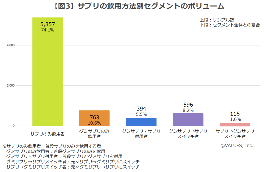 また、グミサプリ・サプリ併用者は他のセグメントと比べて、飲用理由に健康・美容をあげる人の割合が高く、グミ→サプリスイッチ者は美容や効能を意識し始めたビギナー層、サプリ→グミスイッチ者は続けやすさを求める継続派と整理できます。