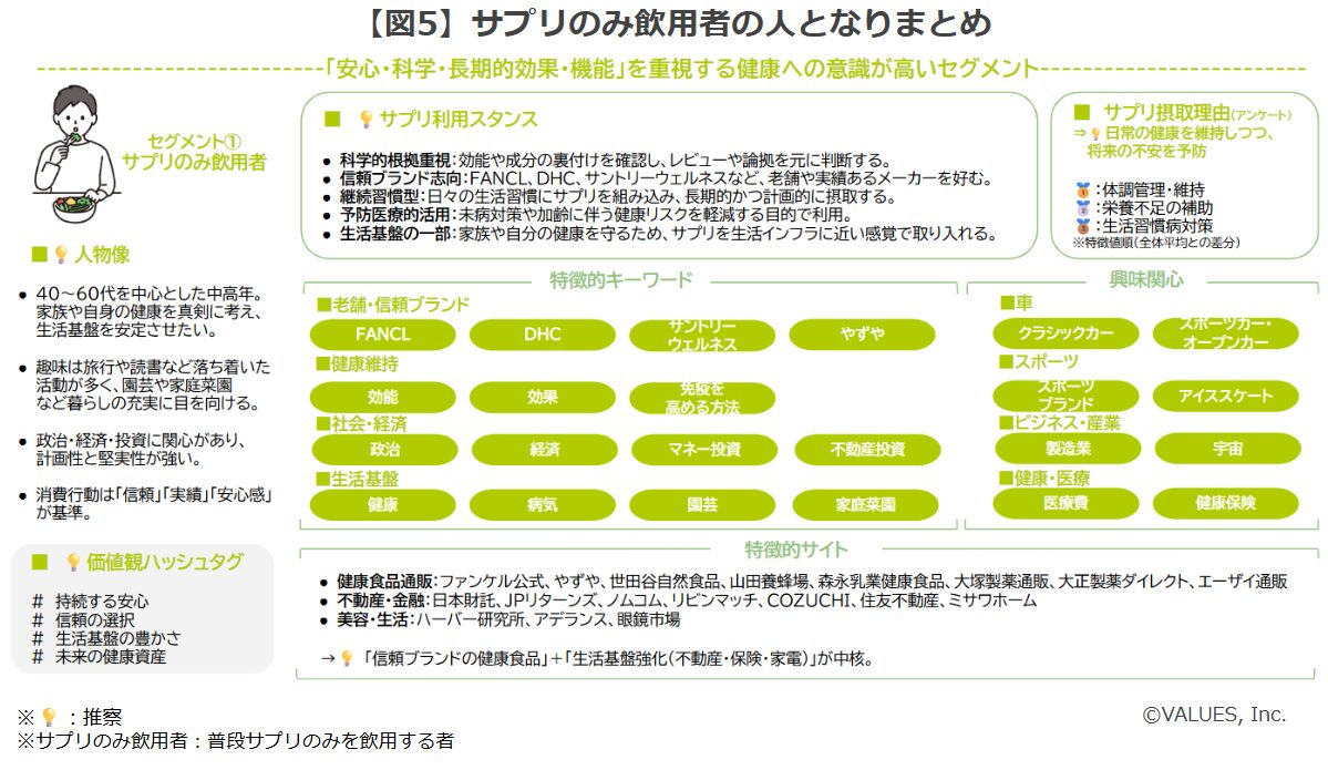 インターネット行動ログ分析によるマーケティング調査・コンサルティングサービスを提供する株式会社ヴァリューズ(本社:東京都港区、代表取締役社長:辻本 秀幸、以下「ヴァリューズ」)は、国内の18歳以上の男女38,015人を対象に、飲用しているサプリメントに関する消費者アンケート調査を実施しました。また、Web行動ログとアンケートデータを活用した分析ツール(「Dockpit(ドックピット)」「Perscope(ペルスコープ)」)を用いて、サプリメント市場を調査。サプリメント利用者を種類別にセグメント分けし、それぞれの価値観や特徴的な検索ワードなどを分析しました。