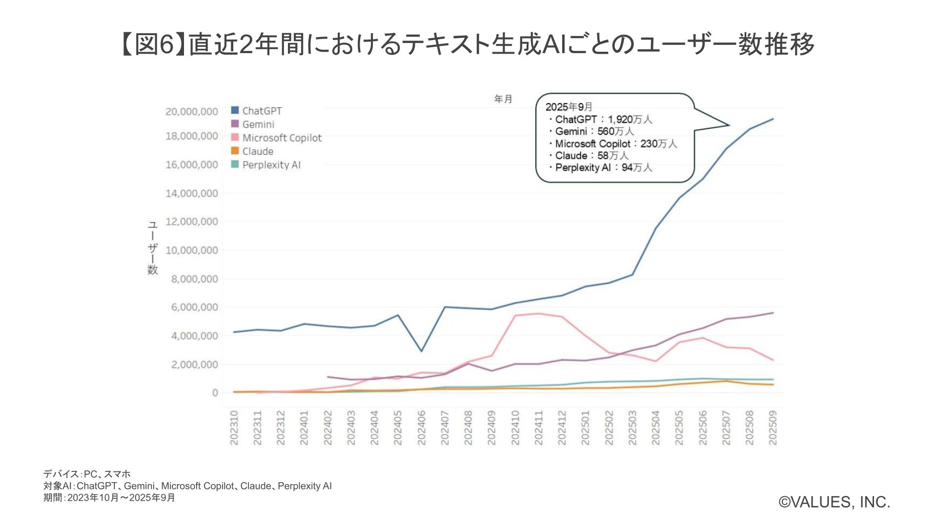 テキスト生成AIではChatGPTが圧倒的で、2025年に入ってからユーザー数をさらに伸ばし、9月には1,920万人を記録しました。