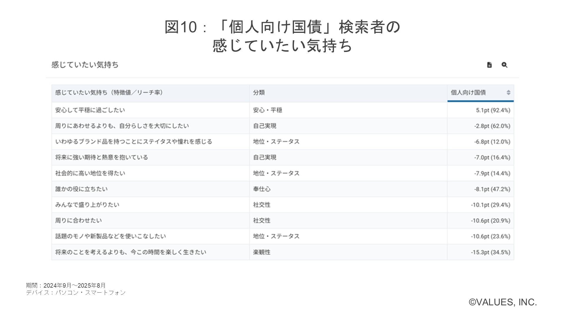 富裕層が国債を選ぶ理由は「金利」だけではありません。検索者の価値観を分析すると、1位は「安心して平穏に過ごしたい」となっており、元本割れがなく国が発行する「安全性」が、安定を重んじる層に強く支持されていると考えられます。
