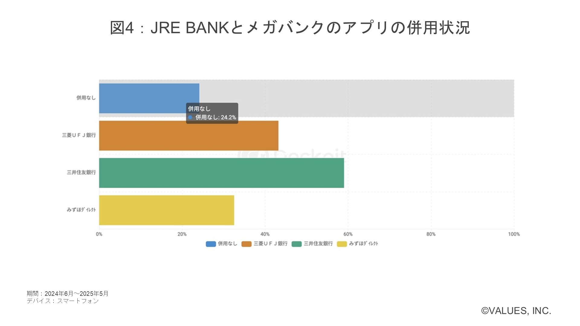 ユーザー属性には特徴があり、男女比が男性約75%と、他メガバンクと比べても極めて高くなっています。年代はメガバンクと同様に50~60代がピークです。興味深いのは併用状況で、JRE BANKユーザーの約75%がメガバンクのアプリも併用している点です。店舗サポートが手厚いメガバンクをメインとしつつ、日常の移動でお得な特典が得られるJRE BANKを賢く使い分けている生活者像が浮かび上がります 。