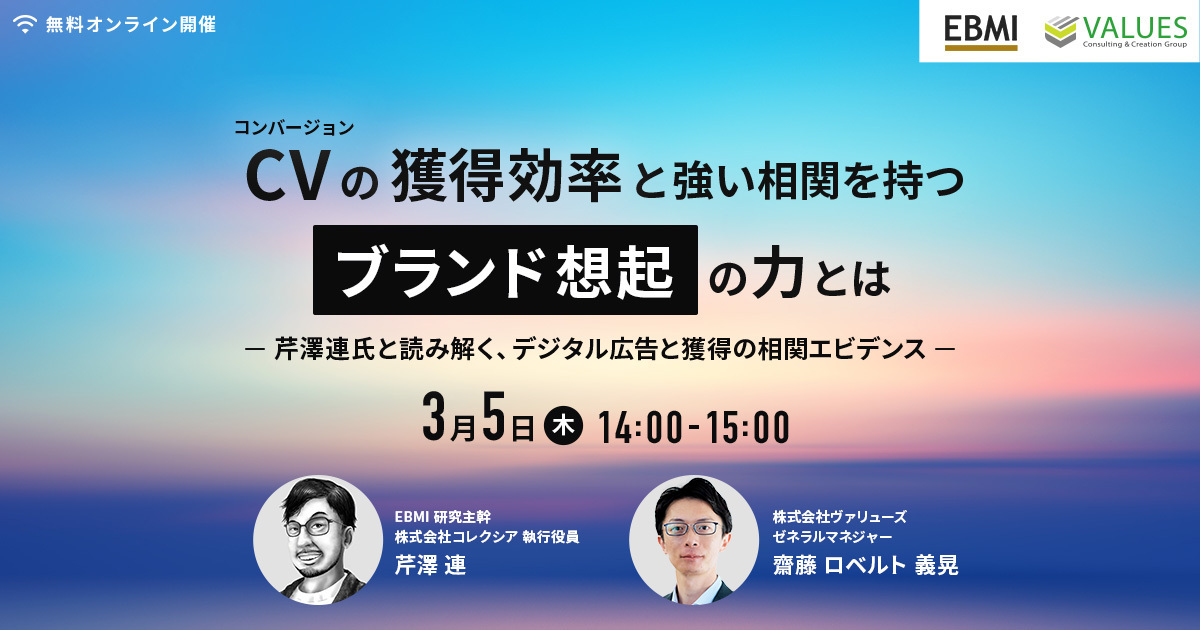 インターネット行動ログ分析によるマーケティング調査・コンサルティングサービスを提供する株式会社ヴァリューズ(本社:東京都港区、代表取締役社長:辻本 秀幸、以下「ヴァリューズ」)と一般社団法人日本エビデンスベーストマーケティング研究機構(代表理事:木田浩理、以下「EBMI」)は、2026年3月5日(木)に、無料オンラインセミナー「コンバージョンの獲得効率と強い相関を持つ『ブランド想起』の力とは」を共催いたします。