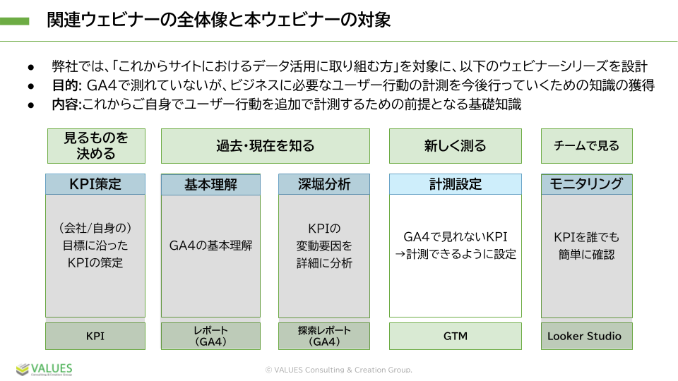 本ウェビナーでは、皆さま一人ひとりの「これを測りたい!」を実現するために欠かせないGTM 活用の基礎をわかりやすく解説し、必要な計測設定を自力で調査しながらチャレンジできる土台を築いていだくことを目指します。