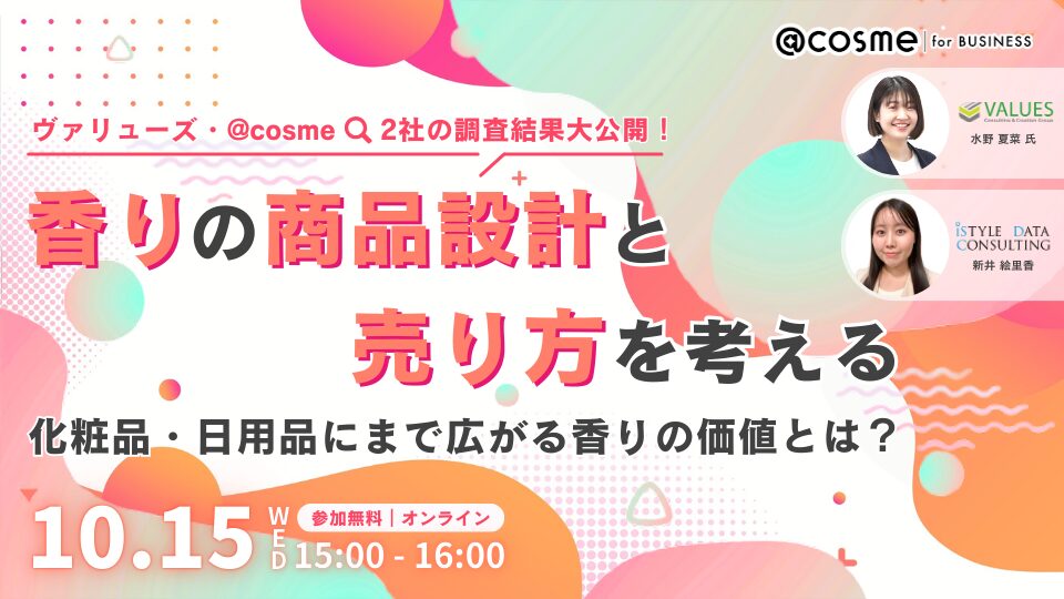 2025年10月15日(水) 申込受付終了ウェビナー無料 ヴァリューズとアイスタイルが独自調査結果を初公開!香りの商品設計と売り方を考える - 化粧品・日用品にまで広がる香りの価値とは? Web行動ログ×アンケート共催