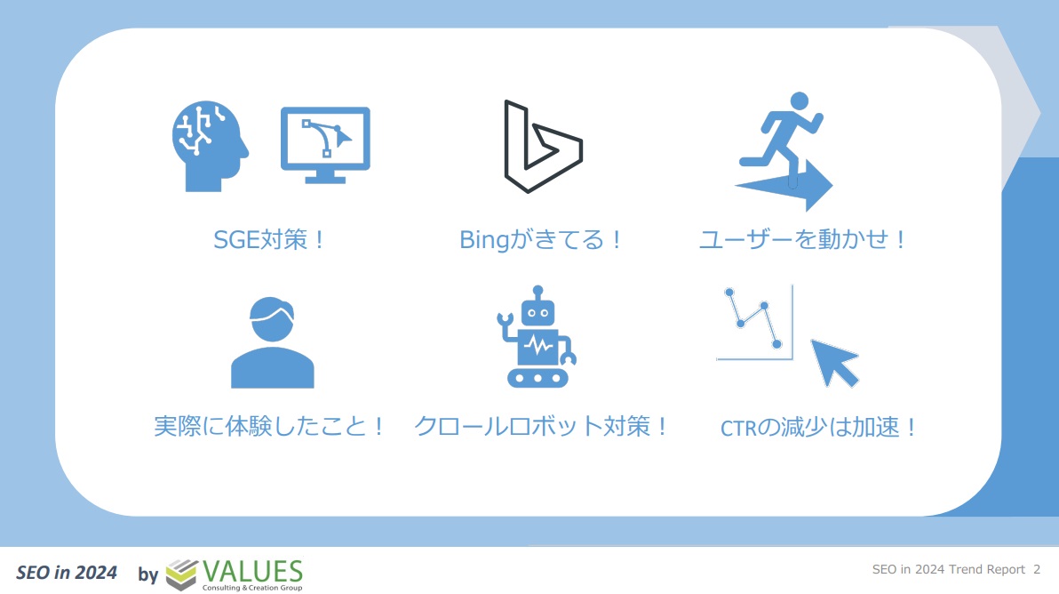 2024年のSEO動向として、予測されるのは以下の6項目です。