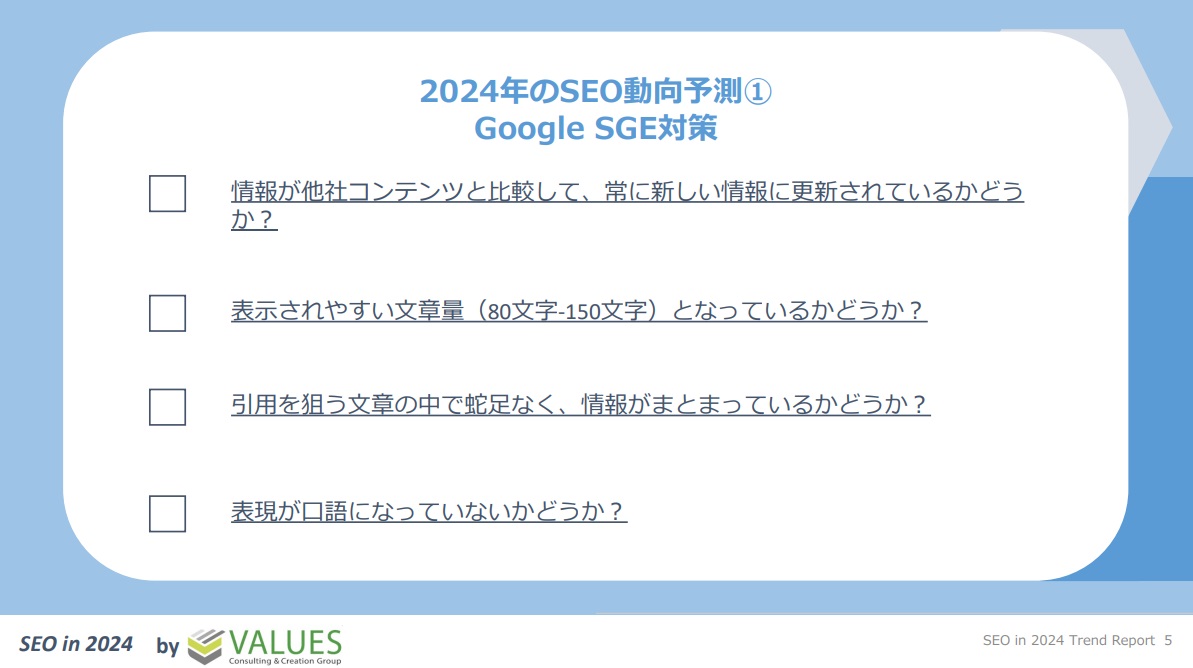 ChatGPTなどの革新的な生成系AIの登場が相次ぎ、先が予測しづらい時代。2024年のSEOを考える上で、コンテンツマーケターが今から押さえておくべきポイントとはどのようなものなのでしょうか。日本最大級のSEO研究用データベースを保有し、Googleの考え方を熟知したヴァリューズが、新年に取るべきアクションのチェックリストを作成しました。
