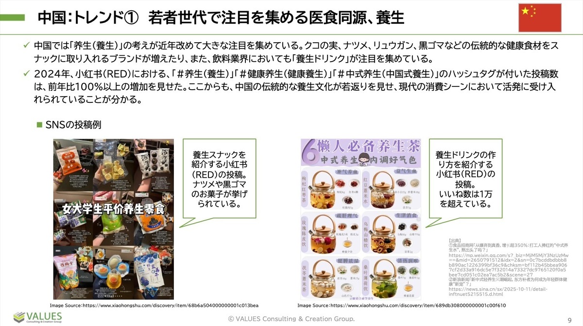 例えば、クコの実、ナツメ、リュウガン、黒ゴマなどの伝統的な健康食材をスナックに取り入れるブランドが増えたり、飲料業界においても「養生ドリンク」が注目を集めています。