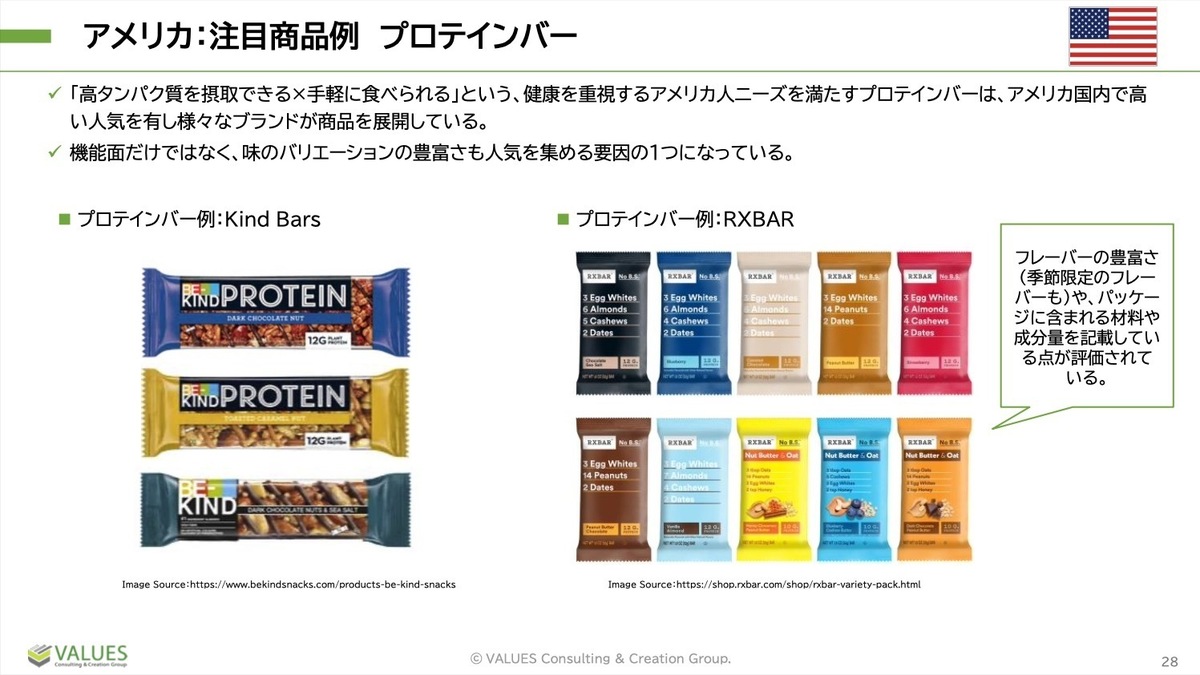 RXBARという商品に関しては、機能面だけではなく、味のバリエーションの豊富さやパッケージに原材料成分量が明記されている点なども含め、人気を集める要因となっています。