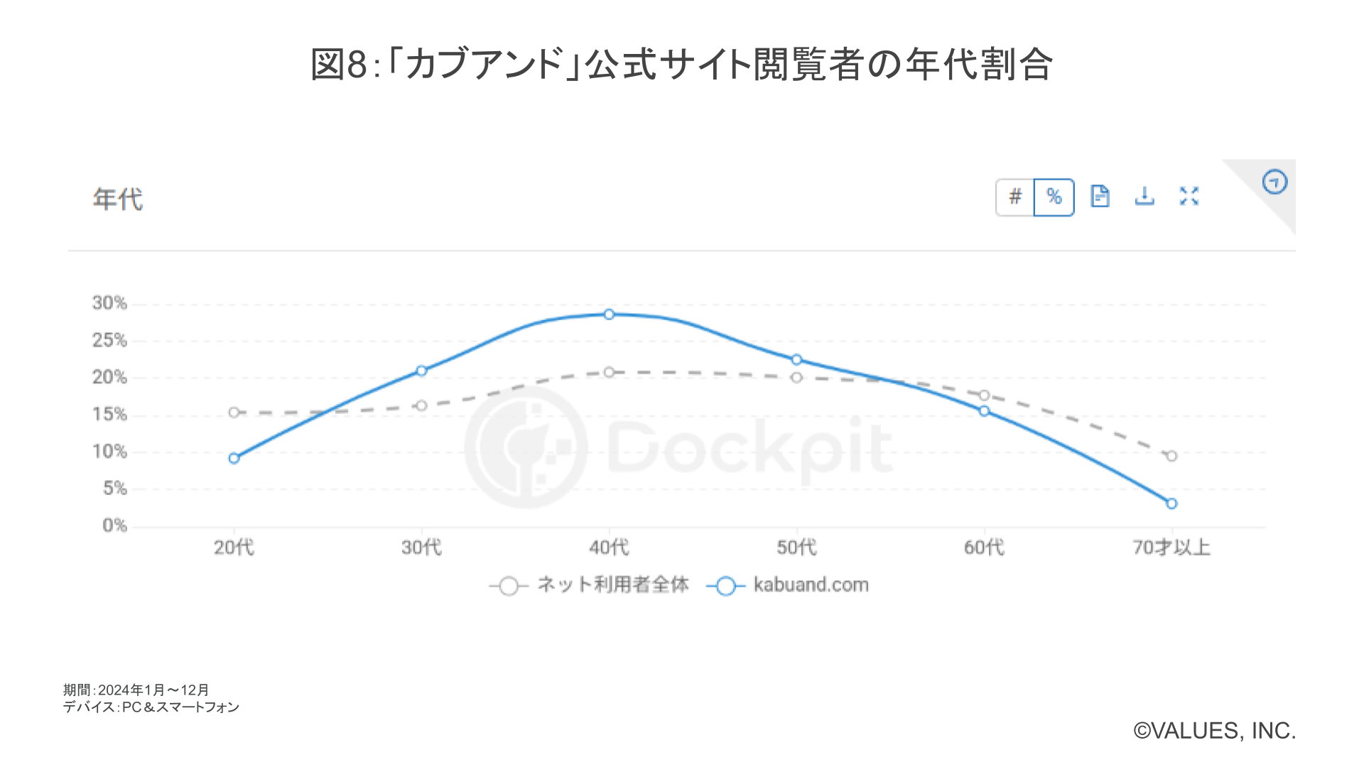 このトレンドに反応している層を男女比で見ると、男性が約63%と過半数を占めています。年代別では、ネット利用者全体と比べても30~40代の割合が高く、50代もボリュームゾーンとなっています。