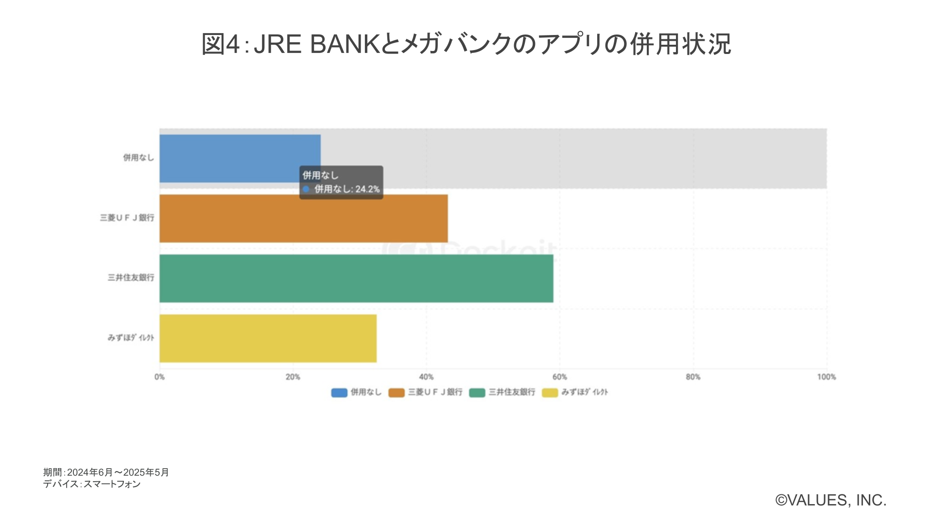 ユーザー属性には特徴があり、男女比が男性約75%と、他メガバンクと比べても極めて高くなっています。年代はメガバンクと同様に50~60代がピークです。興味深いのは併用状況で、JRE BANKユーザーの約75%がメガバンクのアプリも併用している点です。店舗サポートが手厚いメガバンクをメインとしつつ、日常の移動でお得な特典が得られるJRE BANKを賢く使い分けている生活者像が浮かび上がります 。