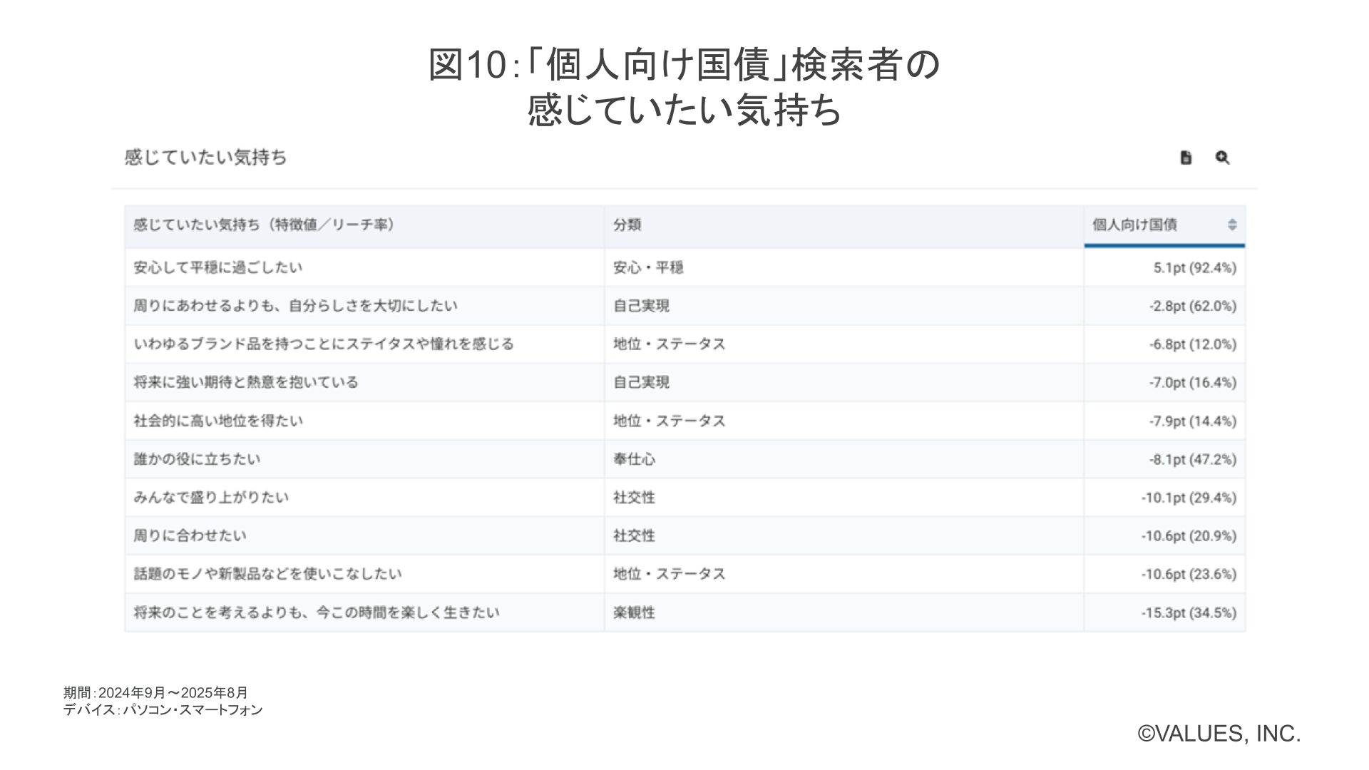富裕層が国債を選ぶ理由は「金利」だけではありません。検索者の価値観を分析すると、1位は「安心して平穏に過ごしたい」となっており、元本割れがなく国が発行する「安全性」が、安定を重んじる層に強く支持されていると考えられます。