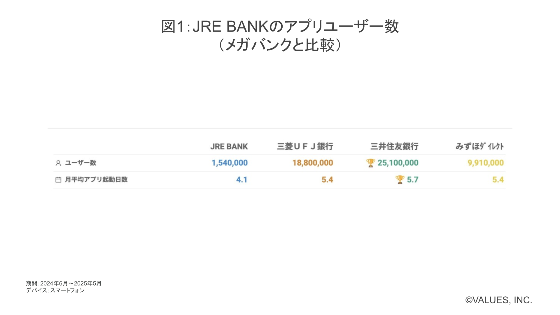 JR東日本グループが手がける「JRE BANK」は、2024年5月のサービス開始以来、鉄道優待やJRE POINT還元といった強力な特典を武器に急速に利用者を伸ばしています 。 アプリのユーザー数(2024年6月~2025年5月平均)を比較すると、JRE BANKは約154万人 。メガバンク3行(約991万~2,510万人)とのユーザー数の乖離はあるものの、ネット銀行のソニー銀行(約263万人)やSBI新生銀行(約323万人)を追う規模にまで成長しています。