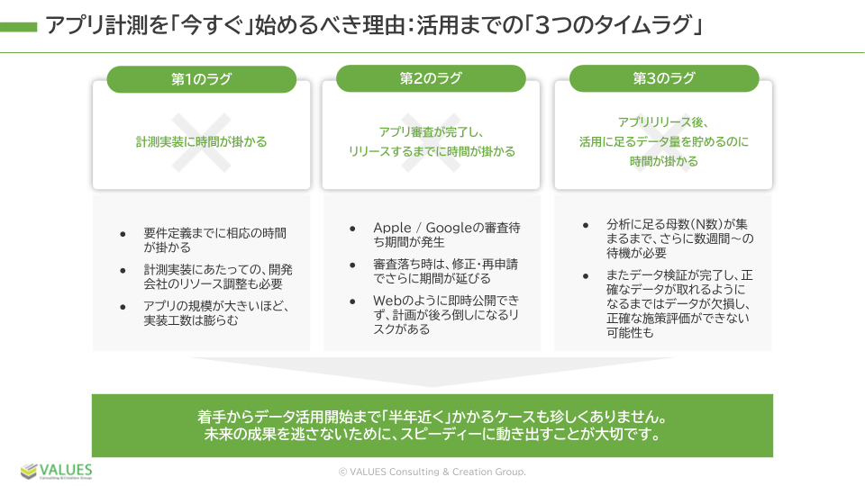 アプリ計測には、Webにはない独自の「タイムラグ」が存在します。半年後に後悔しないためのスピード感の重要性を解説しています。