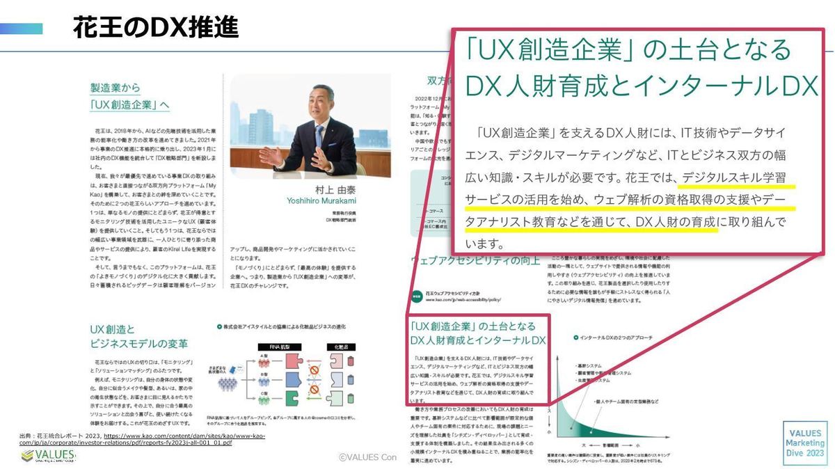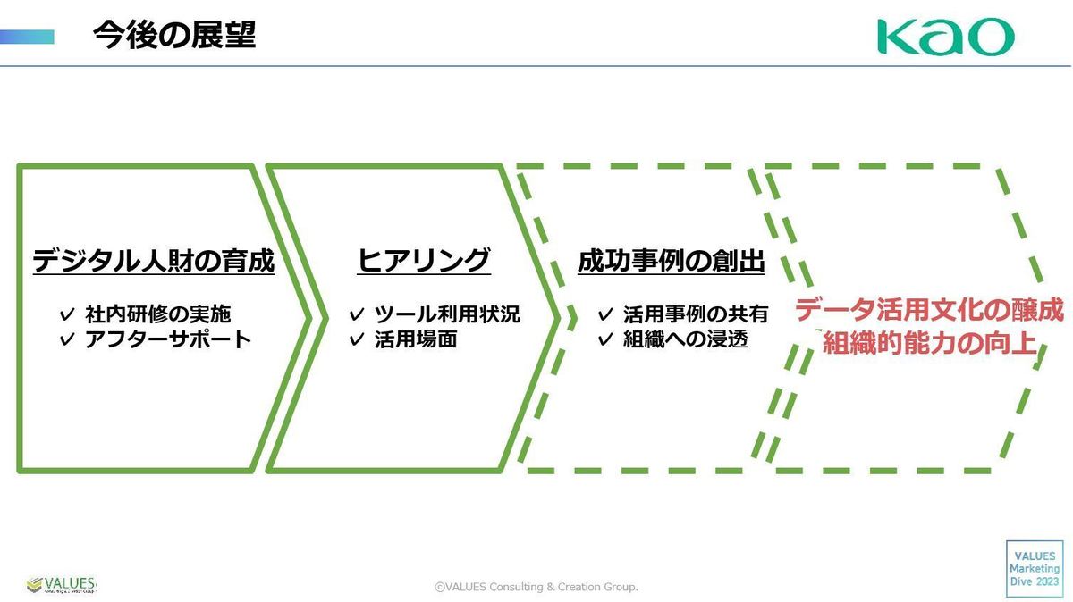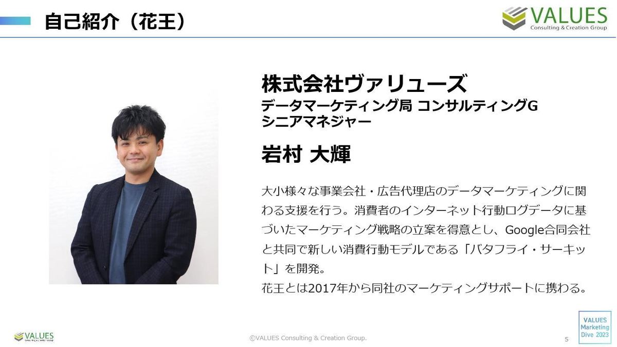 株式会社ヴァリューズ 岩村 大輝(以下、岩村):「VALUES Marketing Dive」第1回では、花王流のデータ分析やツール活用事例についてお話しいただきました。今回はその活用法について、全社でどのように推進されているのかを伺います。