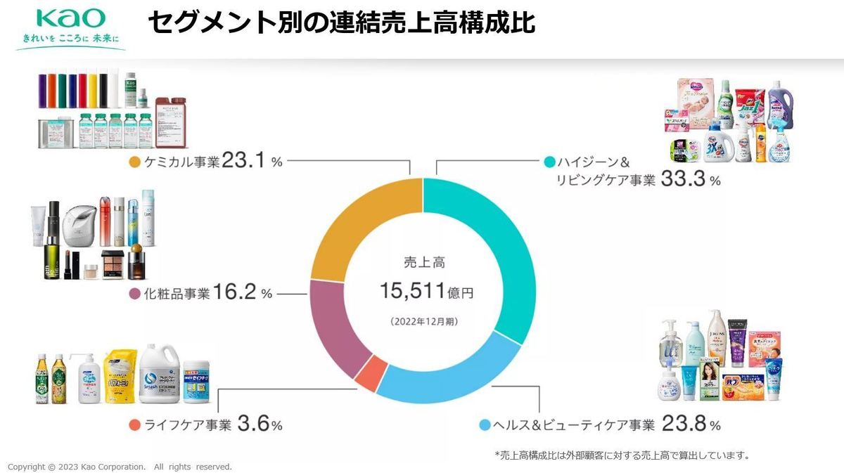 花王株式会社 志佐 麗奈氏(以下、志佐):花王の売上高の77%を占める「コンシューマープロダクツ事業」は、「ハイジーン&リビングケア」「ヘルス&ビューティケア」「ライフケア」「化粧品」という生活者に向けた4つの事業分野になります。残りの23%は「ケミカル事業」で、業界のニーズに対応した製品を幅広く展開しています。