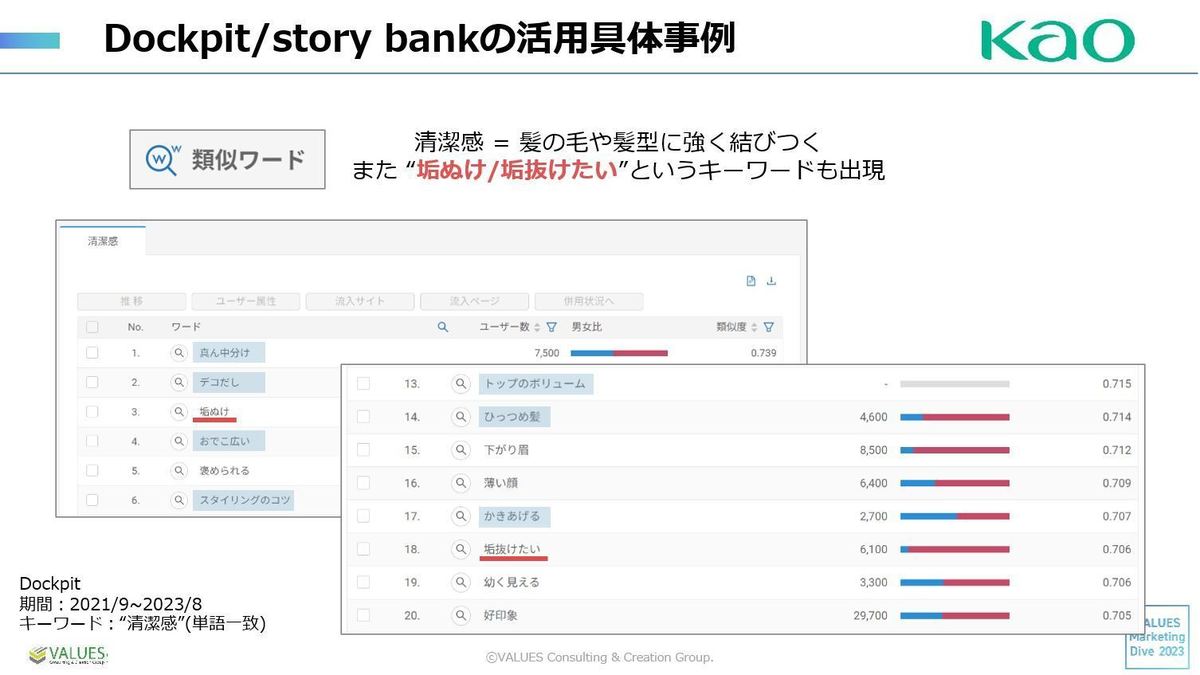 具体的には、ドライシャンプーは「日中の清潔感を保つ」商品なので、まず「清潔感」というキーワードを入れてDockpitで分析しました。すると類似ワードとして「真ん中分け」「かき上げる」など髪型に関するワードや、「垢抜け」「垢抜けたい」というワードがあがってきました。