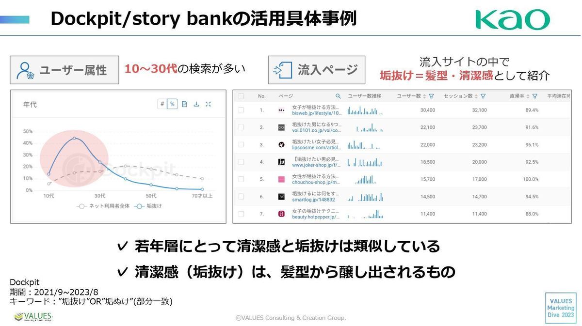志佐:さらに「垢抜け」という言葉がどういう捉え方をされているのか調べるために、「垢抜け」のキーワードで再度分析しました。ユーザー属性では10~30代の検索が多く、また「垢抜け」を検索した人がどんなページに入っているか分析したところ、「垢抜け」が髪型と関連していることが分かりました。