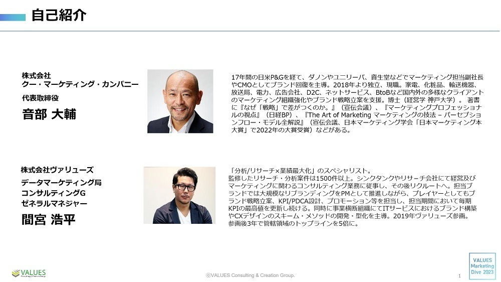 株式会社ヴァリューズ 間宮浩平(以下、間宮):音部さんに続き、私から優秀なマーケターが実践するデータへの向き合い方について解説します。