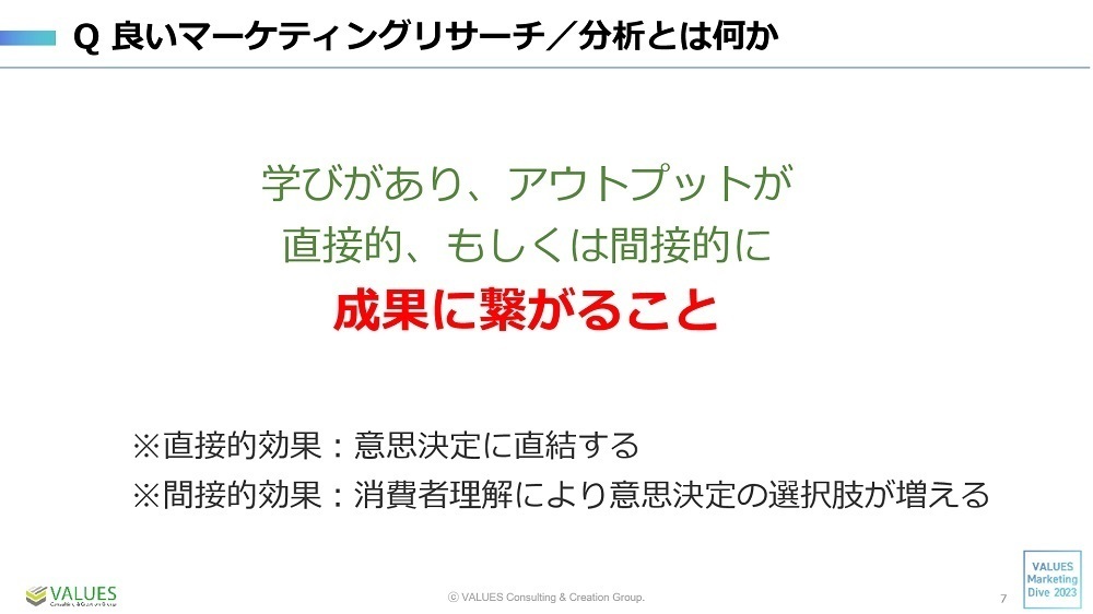 本日は良いリサ―チ・分析のアウトプットを、リサーチによって意思決定の精度が上がったり、消費者理解により意思決定の選択肢が増えること、つまり直接的もしくは間接的にも成果に繋がること、と定義して話を進めていきます。
