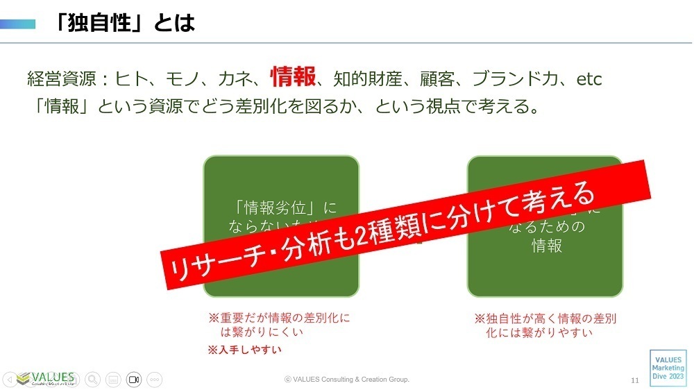 私はリサーチや分析から情報を収集する際、その情報が「情報劣位にならないための情報」なのか、「情報優位になるための情報」なのか、どちらにあたるのか、ということを意識しています。調査委会社などで汎用化されパッケージになっているリサーチなどから得られる示唆は、他社も容易に手に入る情報と位置づけ、「情報劣位にならない為の“情報」として位置付けるようにしています。当然、調査会社でもナレッジマネジメントが行われ、様々なリサーチソリューションが型化されていきます。その為、他社で再現が難しい(模倣困難性が高い)「情報優位になるための情報」を“資源”として活用すること、つまり独自性の高い情報が競争優位をもたらしやすいと考えています。