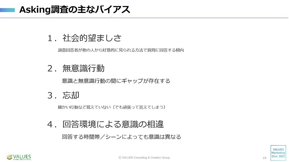 間宮:ここからは調査設計時のポイントを解説します。音部さんより「消費者がブランドに対する本質的な気持ちに気づいていない場合、インタビューを実施しても適切な回答を得ることができない」という事例をご紹介いただきました。これは消費者調査のバイアスによる評価誤差の一例ですが、アスキング型の調査には様々なバイアスがかかります。具体的には回答者が他の人から好意的に見られる方法で質問に回答する傾向(社会的望ましさ)や、細かい行動など覚えていないが頑張って答えてしまう(忘却)などがあります。どんな調査手法でも完璧なものはなく、それぞれメリット・デメリットがあります。そのメリデメを加味した上で調査手法を組み合わせることが重要です。ヴァリューズの提供しているwebログデータを用いて上手くスピーディに仮説構築したり、アスキング型調査と組み合わせて顧客理解を深めていくことも検討してみてはいかがでしょうか。