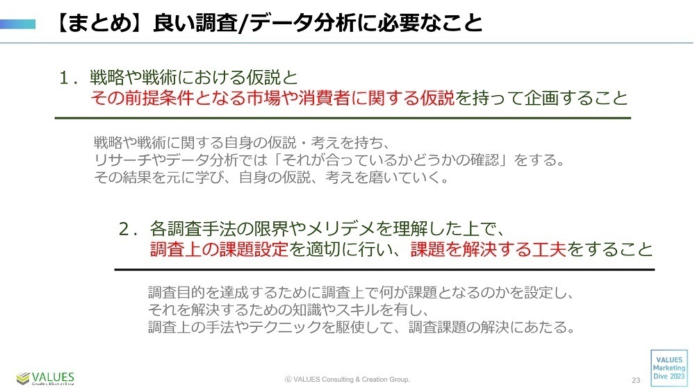 間宮:本日のまとめです。良い調査/データ分析に必要なポイントを2つお話してきました。