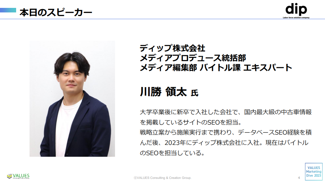 ディップ株式会社 川勝領太氏(以下、川勝):結論、『検索』や 『SEO』の必要性は無くならないと思います。検索というのは非常に難しく、現状のGoogle検索を使用するか、生成系AIを使用するかに関わらず、質問に対して思ったような答えが得られない時があります。マーケターは、検索結果画面がどうなろうと、ユーザーの検索に対して、どのように答えに辿り着いてもらうかを考えることが重要なのではないでしょうか。