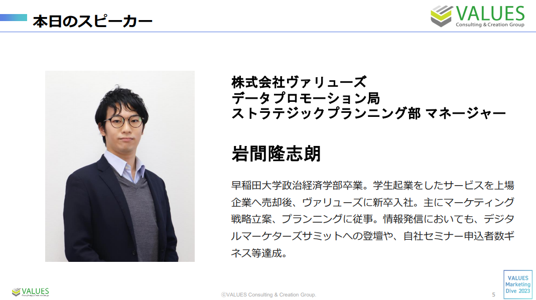 株式会社ヴァリューズ 岩間隆志朗(以下、岩間):まずは前提として、今後生成AIが組み込まれることによって、検索結果画面がどのように変化するのかについて、大きく2つのトピックをご紹介します。