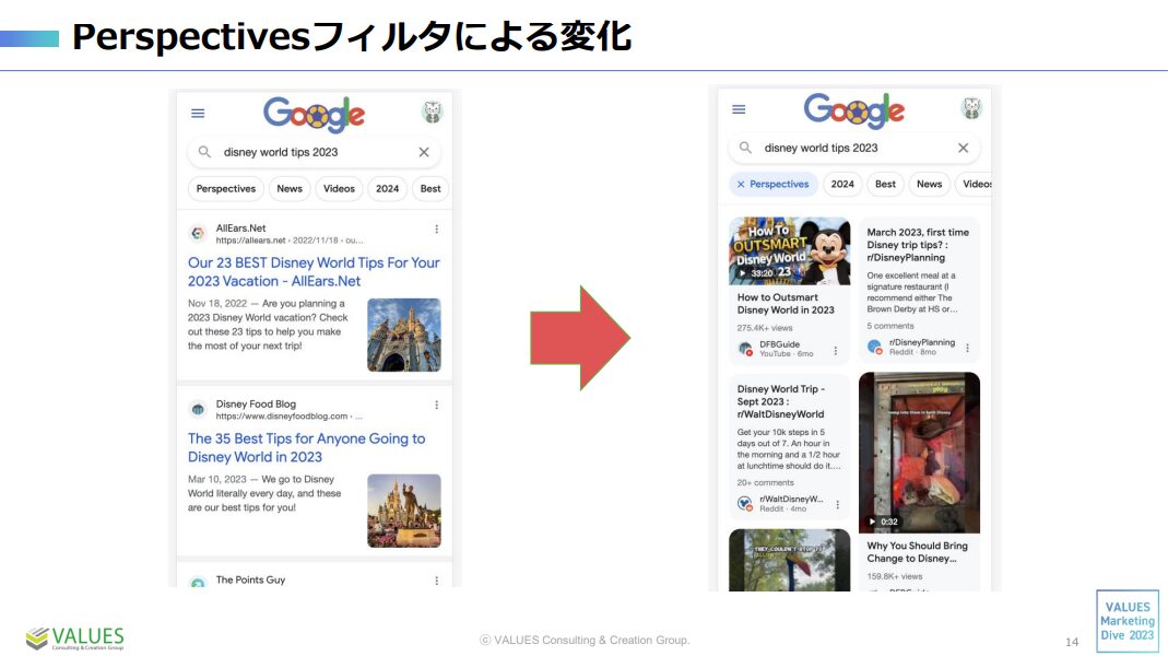 2つ目の変化は、perspectivesフィルタの導入です。perspectivesフィルタとは、経験に基づいたコンテンツのみを検索結果画面に表示する機能です。こちらは既にアメリカでは実装されています。