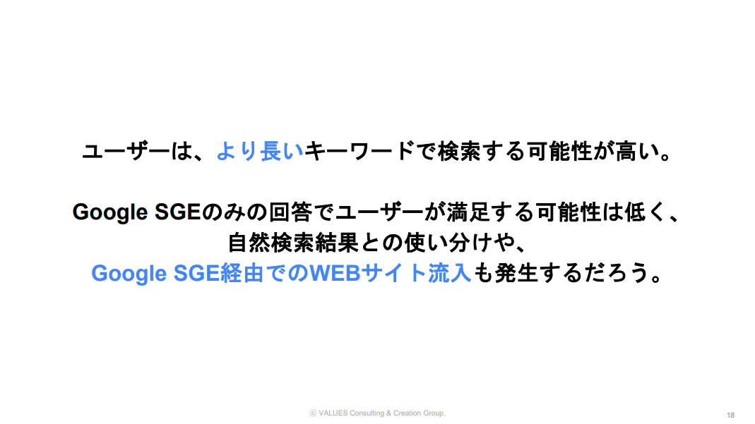 川勝:従来の検索方法と比較すると、検索クエリが長くなることが想定されます。具体的には、検索が単語ではなく質問調になることが予想されます。また、SGEでは回答に対して追加の質問も可能であるため、検索が複数回に渡って長いクエリとして、対話のように検索される可能性も考えられます。