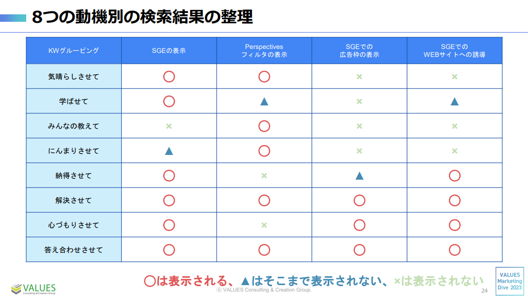 8つの動機はそれぞれ、『どんな情報が欲しいか』 『どのくらいの粒度の情報が欲しいか』などの性質が異なります。アメリカのSGEを我々が研究した結果をご紹介すると、8つの動機に合わせて新しい検索結果画面での表示の有無を確認すると以下のようになりました。