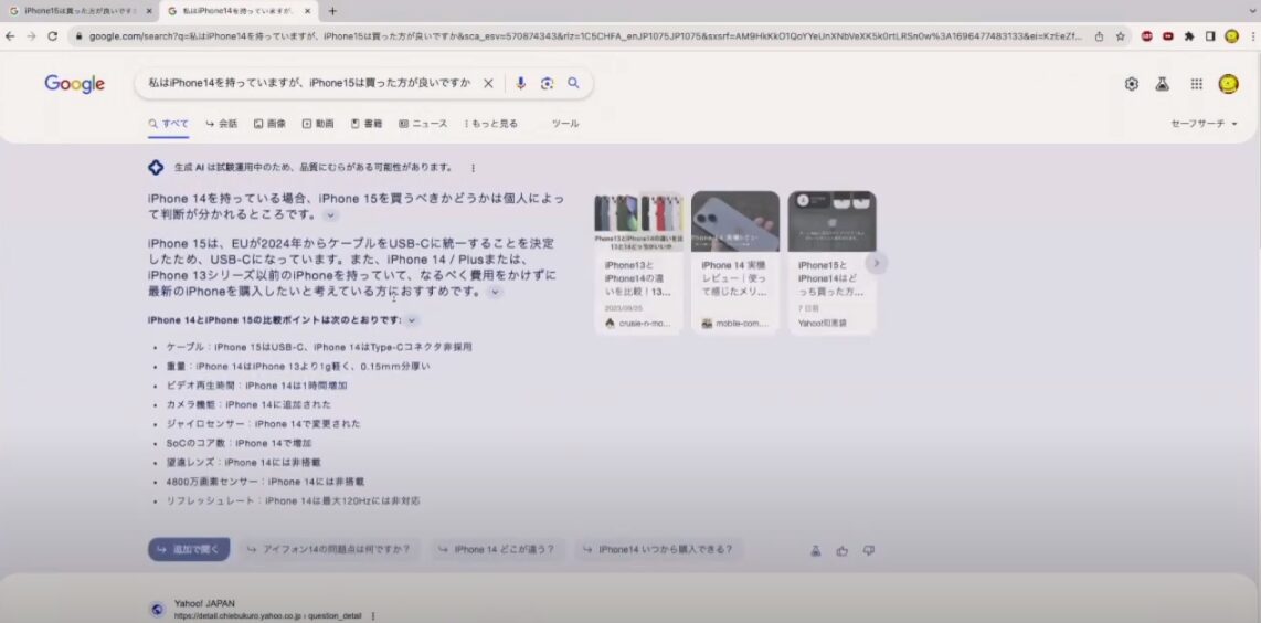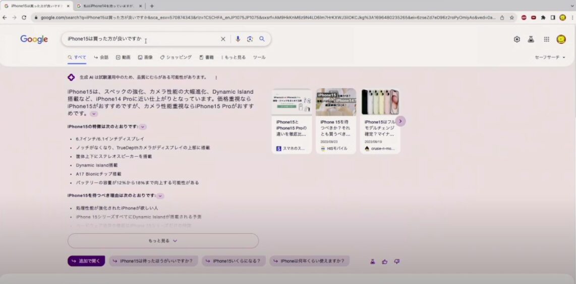 岩間:回答としては不十分なため、より下の検索も広げていく必要がありますよね。では試しに、『私はiPhone14を持っていますが、iPhone15は買った方が良いですか』という前提条件を加えたクエリで検索してみました。この場合だといかがでしょうか。
