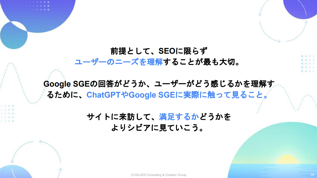 岩間:最後に今後の対策について振り返ります。まず前提として、SEOに限らず ユーザーのニーズを理解することが最も大切です。そのうえで、 Google SGEの回答がどうか、ユーザーがどう感じるかを理解するために、ChatGPTやGoogle SGEに実際に触ってみることが必要というお話でした。 これらの対策を終えた後にも、サイトに来訪したユーザーの満足度をシビアに確認することも重要なようです。