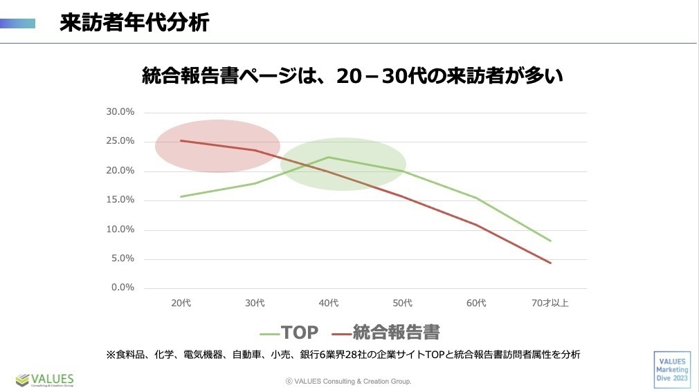 蟹江:私の方では「どのような人が統合報告書を見ているのか」をDockpitを使って深掘りしてみました。下図は統合報告書ページの来訪者年代を各企業サイトTOPと比較しながら分析したものです。これによると、サイトTOPは40〜50代の来訪者が多い反面、統合報告書ページは、20~30代が多いということがわかりました。