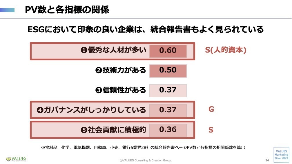 企業イメージと統合報告書PV数の相関を見たところ、①優秀な人材が多い②技術力がある③信頼性がある④ガバナンスがしっかりしている⑤社会貢献に積極的、の5つのイメージと顕著な相関が見えました。これは別の見方をすると、統合報告書を見に来る方は、こういった企業であることを期待して確認しに来ているとも言えます。ですから統合報告書には、これら5つのイメージの期待に応える記載をしていくことが有効であると言えそうです。