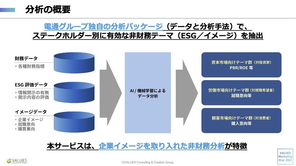 このサービスは、企業イメージやESG活動などの非財務活動・資産が、財務指標や採用活動にどのような影響を与えるのかビッグデータから明らかにするサービスです。
